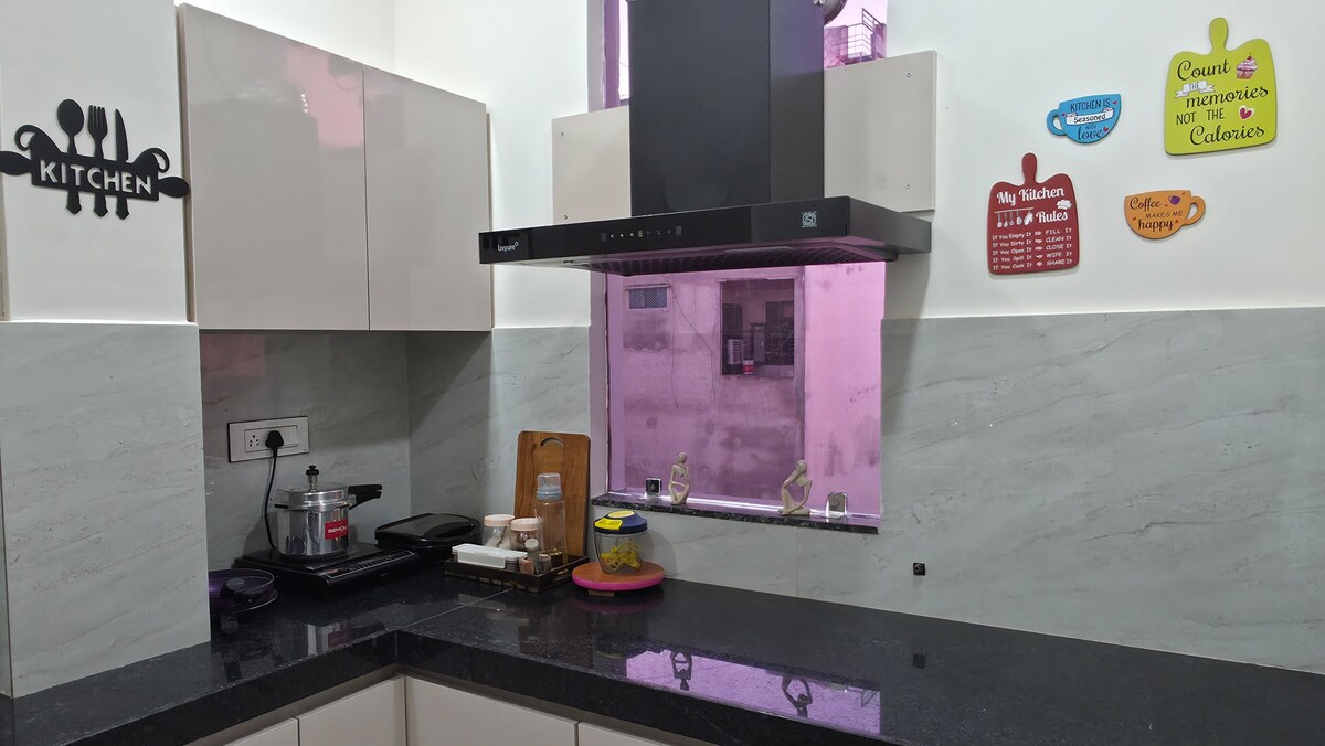 The spacious 3BHK Airbnb offers a perfect blend of modern comfort and style. The expansive living hall is ideal for relaxation while the sleek dining area ensures enjoyable meals. The kitchen makes cooking a breeze. The cozy garden provides a peaceful outdoor retreat. Unwind on the verandah or enjoy NETFLIX on the 65-inch LED TV. With ample space & thoughtful amenities, this contemporary home is perfect for families or groups seeking a stylish, convenient stay with a touch of luxury & comfort.