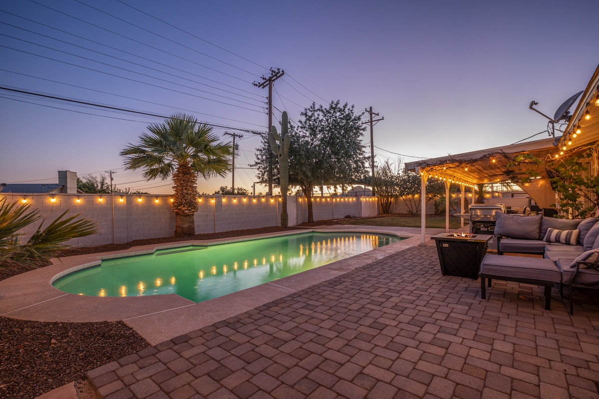 Bienvenido a tu villa privada, a 8 minutos del casco antiguo de Scottsdale, la escapada perfecta. Capacidad para 16 amigos y familiares en la piscina climatizada*, el spa y la chimenea. Cocina afuera en la cocina de la cabaña, música con sonido envolvente en todo, juega ajedrez de tamaño real, cena, bebe vino o descansa en las tumbonas. Desliza la pared de vidrio hacia adentro/afuera para disfrutar de la vida en su máxima expresión. 4 dormitorios, 3,5 baños y un amplio diseño abierto con techos altos en lujo moderno. Diseñado profesionalmente por Style Me GHD.