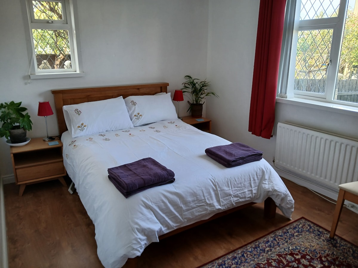 Este alojamiento, que es un acogedor y espacioso refugio, es adecuado para parejas, amigos o familiares. Cuenta con 1 cama tamaño king de lujo, 1 cama doble de lujo, una cuna de viaje y una cama plegable adicional a petición. A solo 3 pasos de la planta baja, lo que lo hace de fácil acceso, este lugar tiene todo lo que necesitas para tu estancia, ya sea un día o un mes, a 2 minutos en coche o a 10 minutos a pie del centro de la ciudad, garaje, supermercados, comida para llevar, centro de jardinería, cine, estación de autobuses y tren a Belfast a poca distancia a pie.
