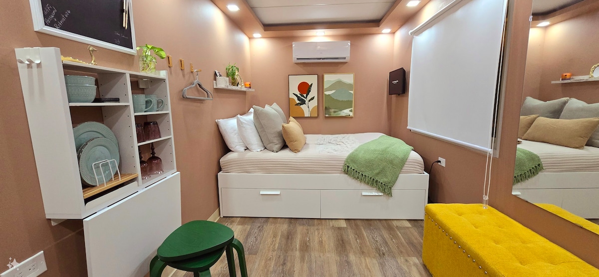 Enjoy a unique experience in this modern short-term rental container home, located near the best beaches in Arecibo. Ideal for those looking for a quiet stay close to the sea, this property offers a spectacular view of the Atlantic Ocean from its terrace. The container is fully equipped with a functional kitchen, private bathroom, and an outdoor half bath for convenience. Relax in the heated pool