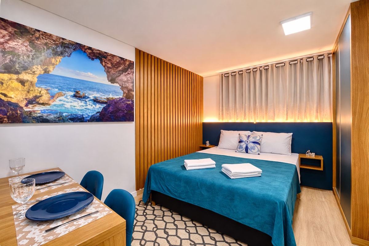 Estudio moderno, nuevo, acogedor, ubicación perfecta, con una hermosa vista desde el balcón, especialmente por la noche. Wifi rápido, escritorio, TV inteligente de 55”, cama Queen. Aire acondicionado (frío/calor). Lavadora y secadora y una hermosa isla en la cocina. 50m2 de mucho estilo-27ºandar, Silencioso. En el Centro/Batel, cerca de comercios, bancos, centros comerciales, polo gastronómico y Hospital. En el edificio: piscina, gimnasio, sala de juegos, sauna, jacuzzi, conserjería las 24 horas.