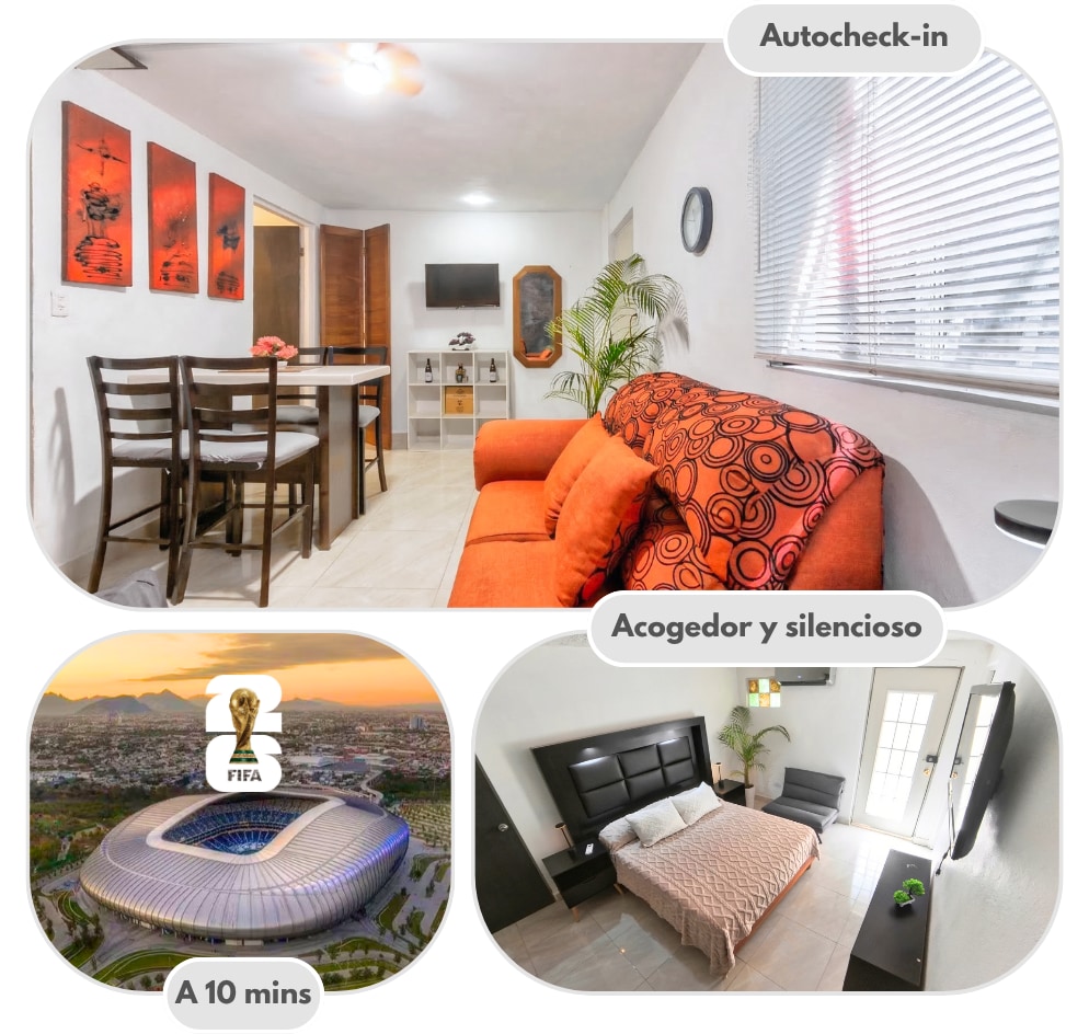 Práctico y cómodo departamento cerca de Cintermex, Arena Monterrey y Auditorio Citibanamex. Ideal para asistir a eventos como Pal’Norte, Machaca Fest y Live Out. Ubicado a pasos de la Arena Monterrey, con fácil acceso desde el aeropuerto, carreteras, autobuses y metro. Tiene capacidad para 4 personas y está amueblado para brindarte una estancia placentera.