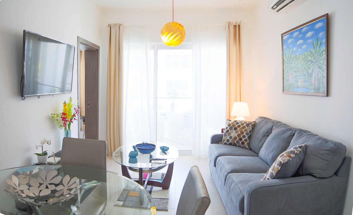 Este espacioso departamento de 120 m2 está ubicado en el corazón de la zona turística de Bávaro y tiene capacidad para cuatro huéspedes. Cuenta con una amplia sala de estar, dos dormitorios, cocina totalmente equipada, balcón, dos baños y wifi gratuito. A solo 10 minutos a pie de la playa de Bávaro, está cerca de los mejores restaurantes, supermercados, tiendas, bares y spa. Ubicado en una residencia cerrada con seguridad 24/7, terrenos bellamente ajardinados y una gran piscina, ofrece la mezcla perfecta de calidad, comodidad y valor.