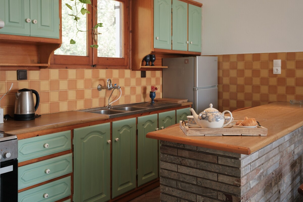 Nuestra casa se encuentra en el lado noroeste de la isla, en el hermoso pueblo de Arillas, ideal para practicar yoga, ubicado en una colina entre las dos playas de Arillas y Agios Stefanos, que está a 15 minutos a pie. Las camas tienen colchones ortopédicos para un gran sueño. Hay un balcón con una sala de estar y una tela de sombra que da al pequeño jardín verde. En la parte delantera de la casa hay un banco donde podrás disfrutar del sol y más adelante hay una cómoda plaza de aparcamiento.