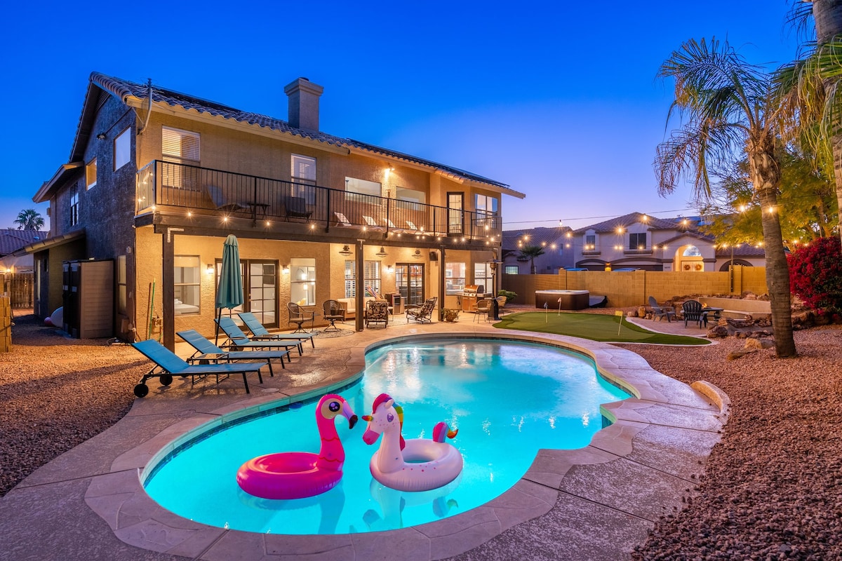 Piscina climatizada durante todo el año (sin cargo). La seguridad y la limpieza de los niños son nuestras principales prioridades. Casa preparada para familias con zona de chapoteo, patio y piscina vallados, y parque infantil privado. 3 camas tamaño «king» California, literas completas. Persianas opacas, tomas USB y máquinas de sonido en todas las habitaciones. Incluye 2 parques de juegos, 2 moisés, 2 tronas, vajilla para niños pequeños y más. Juegos de arcade, minigolf y una cocina totalmente equipada. A menos de 1 milla del centro de Gilbert. Aeropuerto de PHX y casco antiguo de Scottsdale: a 16 millas de distancia.
