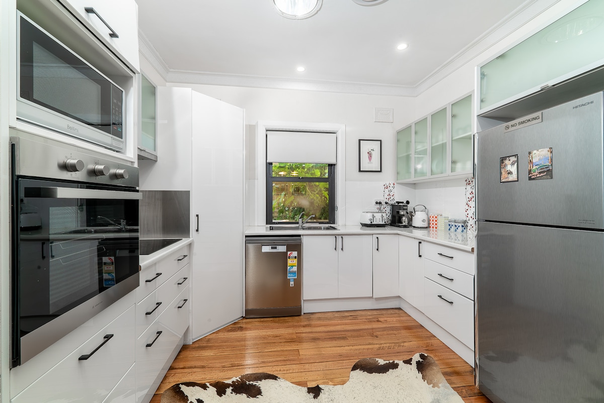 Casa de campo elegantemente renovada, con vistas a Curtis Park. A una cuadra del centro de Armidale, con restaurantes, cafeterías, pubs y supermercados a poca distancia. Armidale Farmers Market en el parque al otro lado de la calle cada segundo domingo del mes. Cocina nueva con electrodomésticos modernos (nevera de tamaño completo, lavavajillas, cocina de gas, horno y microondas), cafetera y cápsulas Nespresso, freidora de aire Internet de alta velocidad con datos ilimitados. Televisión inteligente de 65 pulgadas con Netflix El principal con baño privado Chimenea Aire acondicionado inverso
