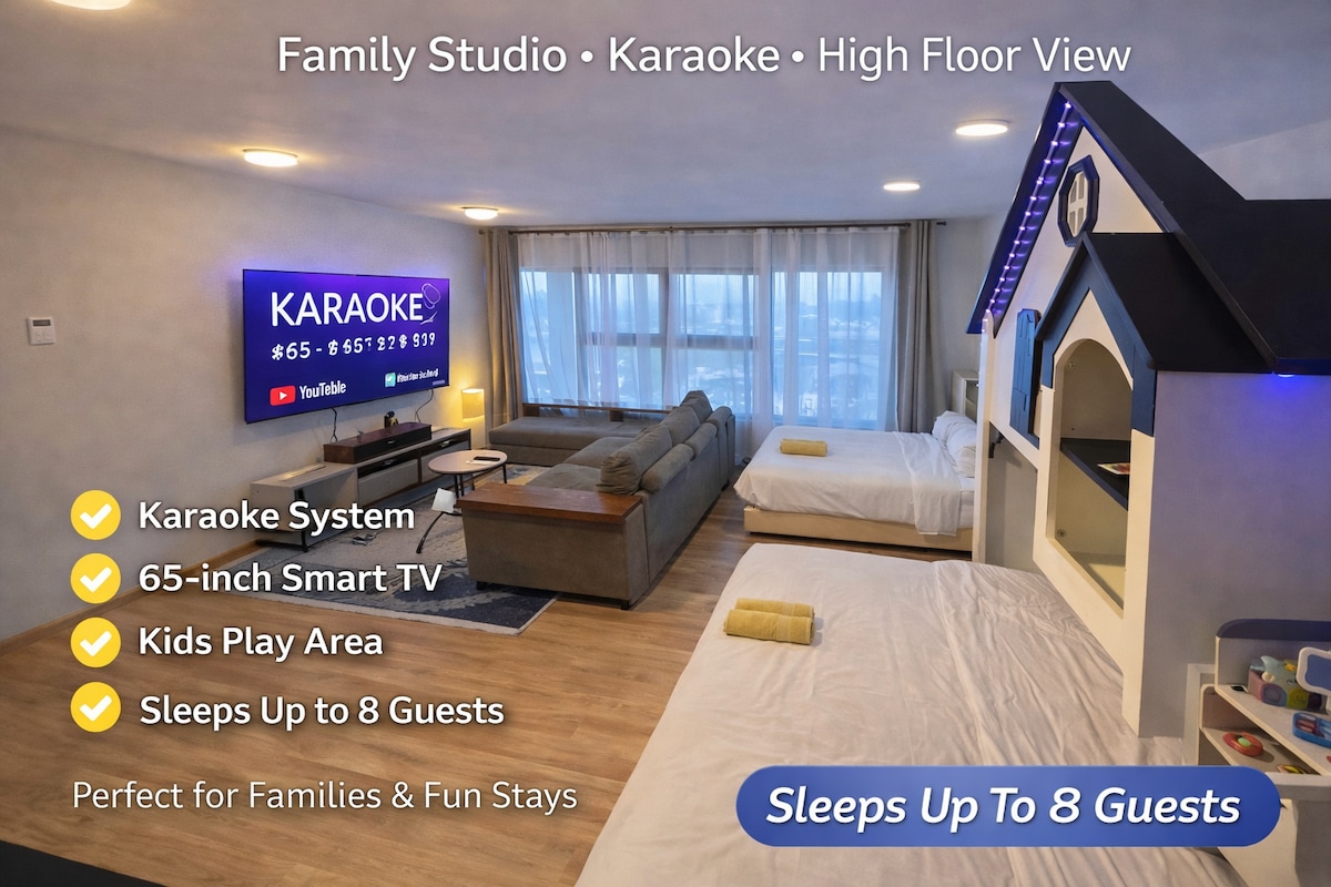 StarSuiteAC: ¡Alojamiento de lujo sobre las nubes! Un dúplex lujosamente diseñado en el piso alto, que ofrece una impresionante vista en la alfombra de las nubes del horizonte de Kuala Lumpur. ¡Relájate bajo el techo estrellado parecido a una galaxia y experimenta una escapada como ninguna otra! Disfruta de una sala de karaoke insonorizada, billar y hockey de aire, y un cine en casa con sonido envolvente para una verdadera experiencia cinematográfica. Instalaciones: cocina, nevera, microondas, olla arrocera, freidora de aire, filtro de agua, lavadora (con secadora), sillón de masaje, etc.