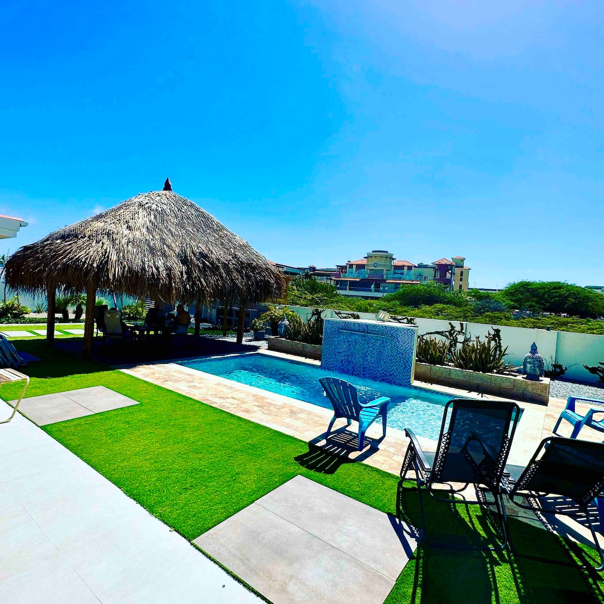 Relájate en Eva's Garden, una villa moderna de 6 dormitorios y 6 baños y medio en Aruba, perfecta para familias o grupos de hasta 12 personas. Disfruta de espacios luminosos, una piscina privada y un patio trasero cerrado. La villa cuenta con televisores inteligentes, wifi de alta velocidad, aire acondicionado, cocina totalmente equipada y lavandería, ofreciendo comodidad y conveniencia cerca de las principales atracciones de Aruba. ✔ Piscina privada y patio trasero cerrado con barbacoa ✔ Cocina totalmente equipada ✔ Servicios para familias y estacionamiento gratuito ✔ 2 apartamentos privados en el jardín