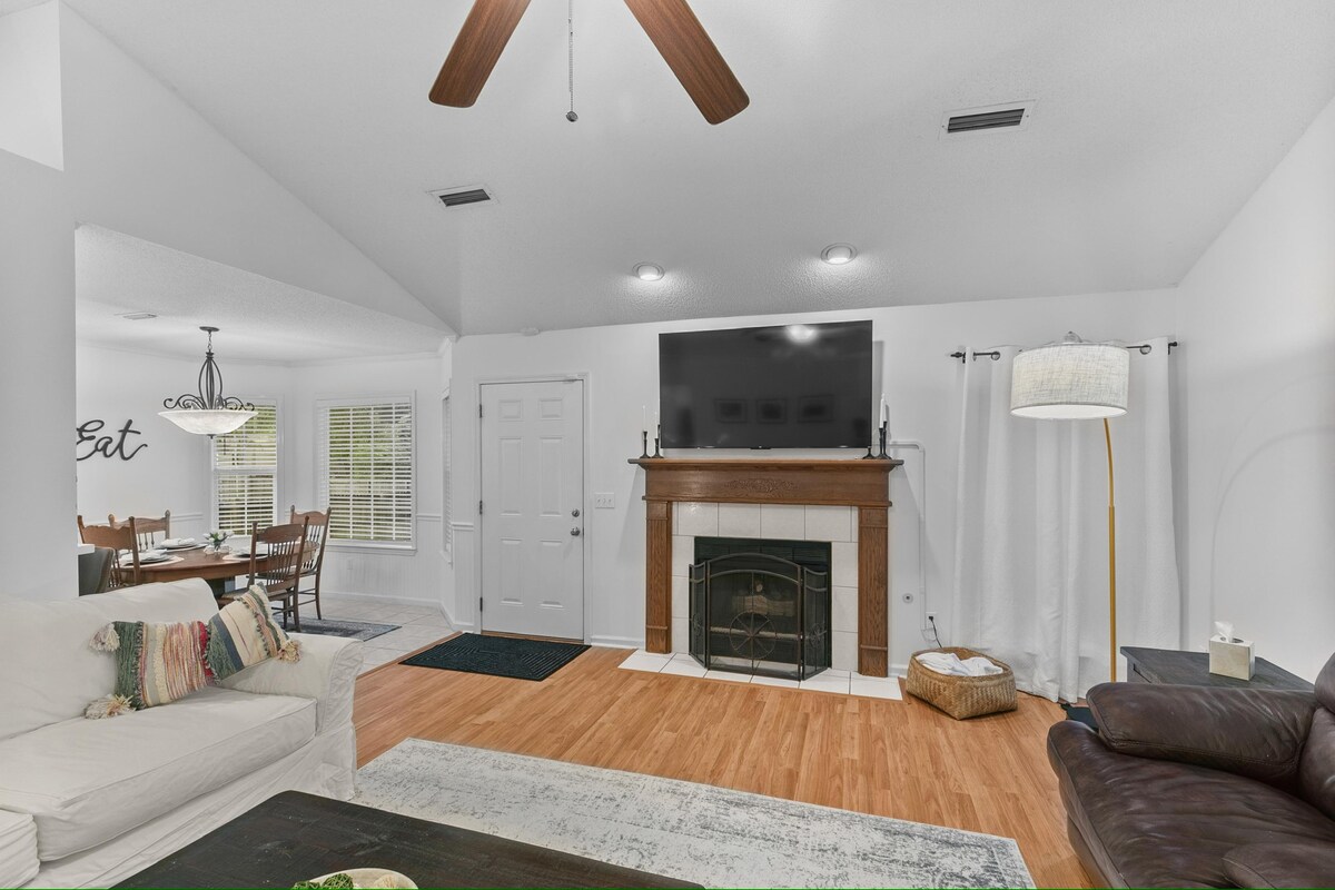 ¡Perfecto para familias! Amplia suite principal tamaño king con bañera de inmersión, vestidor, ventilador de techo, espacio de trabajo y TV Roku de 55". Sala de estar abierta con techos abovedados, TV de 65", chimenea, ventilador de techo y cómodos asientos para noches de cine. Cocina totalmente abastecida con cafetería. Habitaciones con camas tamaño queen, televisores Roku, ventiladores de techo y armarios grandes. 2 baños completos con ducha y bañera en ambos. Terraza trasera tranquila para relajarse. Wifi rápido. Trona y parque de juegos disponibles. ¡Descuentos semanales/mensuales!