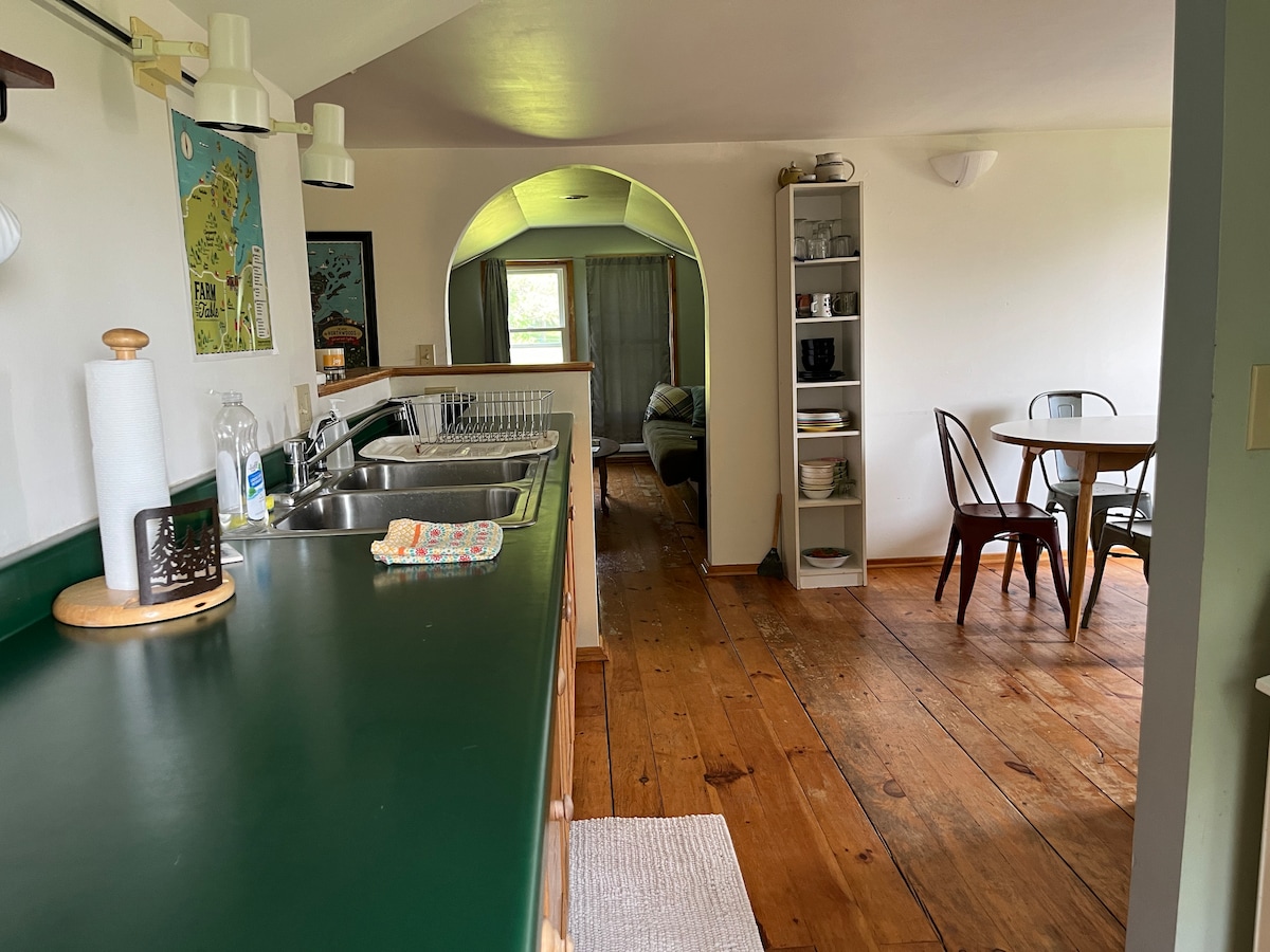 Ubicado a 10 minutos de Bayfield, este es un alojamiento informal, cómodo y acogedor de dos dormitorios ubicado al otro lado de la carretera del lago Superior y las Islas Apóstoles y a menos de una milla de distancia de las mejores playas de la región. Llamado así por el río Onion que fluye cerca, este alquiler tiene una combinación de pisos de pino y azulejos. Cocina y comedor en la planta superior. Césped grande con estacionamiento fácil y abundante. Monte Ashwabay, Big Top Chautauqua cerca. Patio exterior exterior y zona de fogata.
