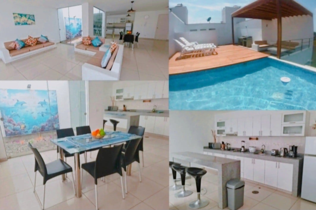Vive una experiencia única frente al mar en esta acogedora casa de playa. Un espacio ideal para familias y grupos (hasta 11 personas), diseñado para descansar, compartir y disfrutar del verano con total comodidad y seguridad. Tienes acceso directo a la playa y excelentes áreas comunes: 🏊 Piscina 🛒 Bodega 🍽 Restaurante 🛝 Juegos para niños La casa cuenta con vista al mar y destaca por su azotea, equipada con kamado cerámico y parrilla, perfecta para compartir y disfrutar del atardecer.