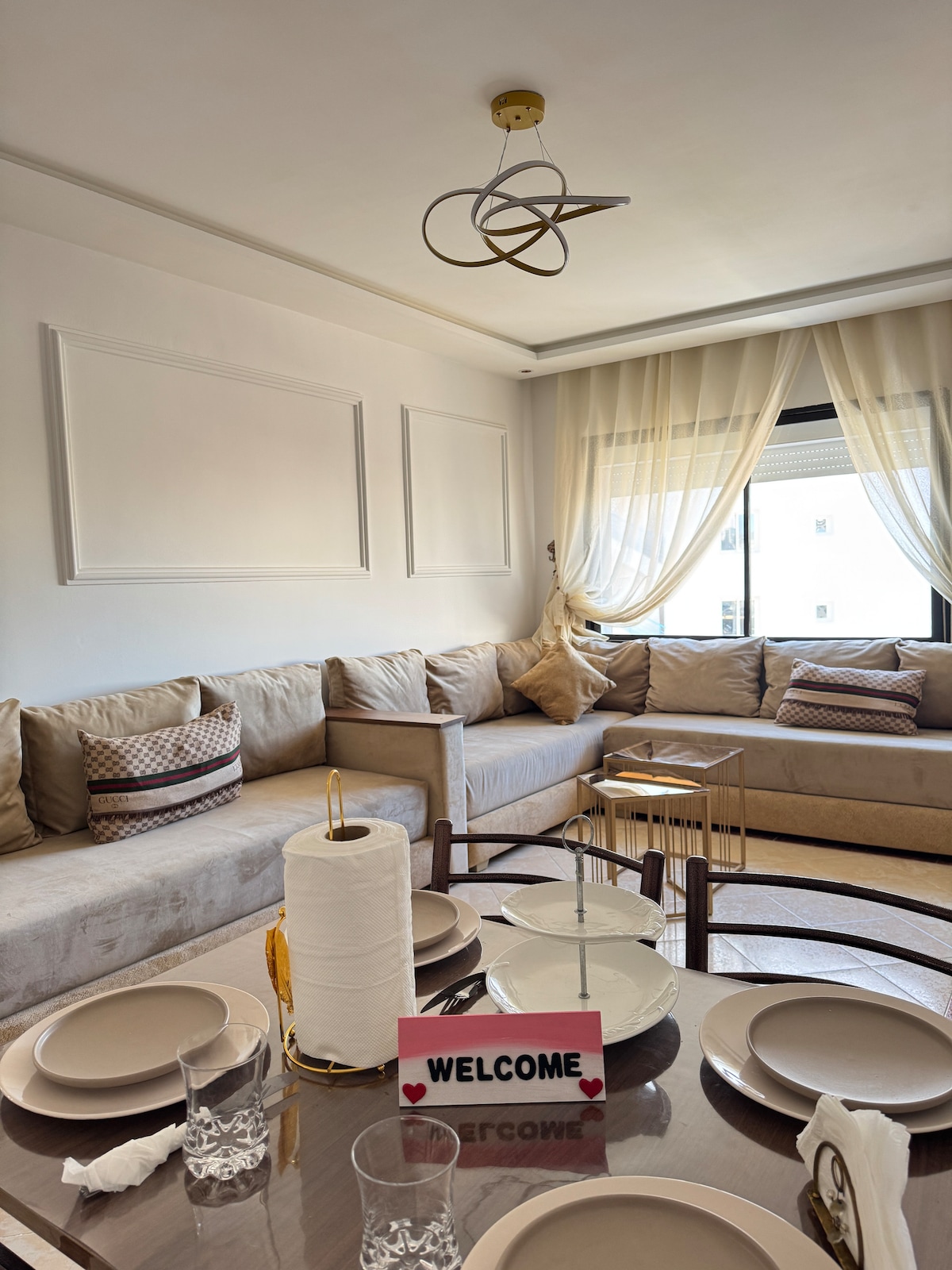 For the lover of well-being and security, a luxury apartment located in a large avenue near to the cornich it' s at your dispostion. Welcome to Tangier/Morocco. Come and live in a brand new sunny and elegant flat. The flat is well equiped. It has a view on thexmain residential and administrative avenue. The neighbourhood is highly secured. It is only 20m far from the main police station and it is in front of the mortgge registry and 50m far from wilaya and theatre.