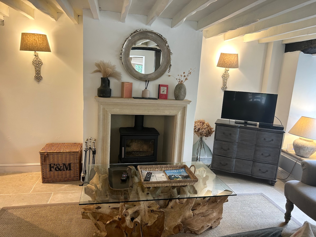 Wisteria Cottage es una casa rural de lujo de alta especificación con calefacción por suelo radiante, estufa de leña, gran cocina/comedor con vistas a los campos y un espacio de servicio/aseo en la planta baja. Arriba hay dos dormitorios con calefacción central y baño con calefacción por suelo radiante y toallero con vigas a la vista. El dormitorio principal tiene una cama tamaño king generosa y la segunda cama, una cama de día individual con una cama nido extraíble debajo. El baño tiene una bañera con ducha y agua caliente ilimitada. Ofrecemos el encanto de Cotswold con lujo moderno.