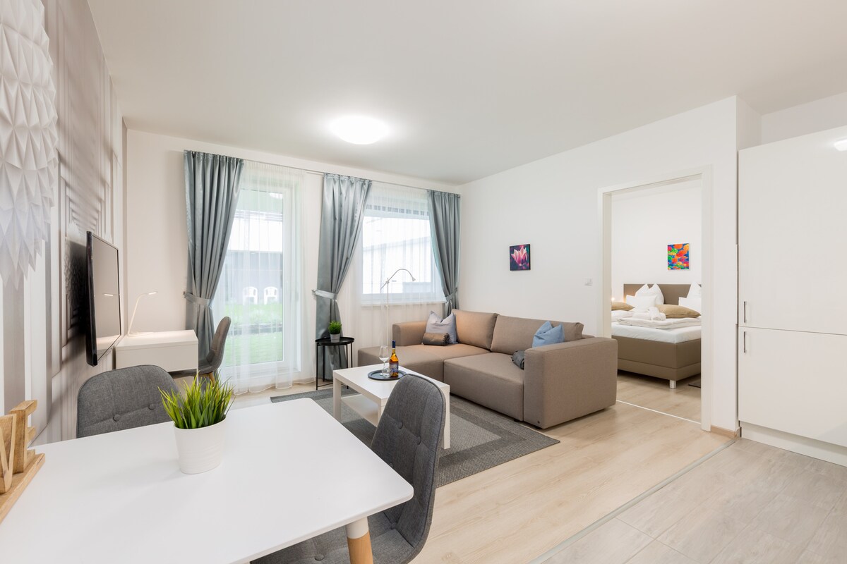 This modern one-bedroom apartment offers a bright and stylish space with a cozy living area, fully equipped kitchen, and sleek bathroom. Large windows bring in plenty of natural light, creating a warm and welcoming atmosphere. Step out onto the private balcony to enjoy fresh air and views of the quiet courtyard. With contemporary design and all essentials provided, it’s perfect for a relaxing stay close to public transport and city attractions.
