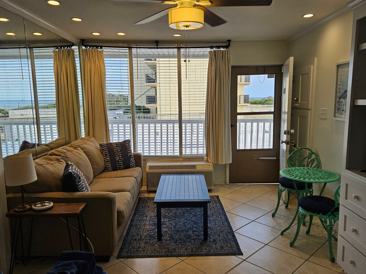 This beautiful studio condo is seconds from the beach by a walkway and gazebo. Lovely living area with TV, sleep sofa, ocean view, fully-equipped kitchen, and an updated bathroom. On-site amenities include a laundry room, pool, grills and picnic tables, gazebos overlooking the ocean and private (to the condo community) beach access. Work from here with private wifi access.