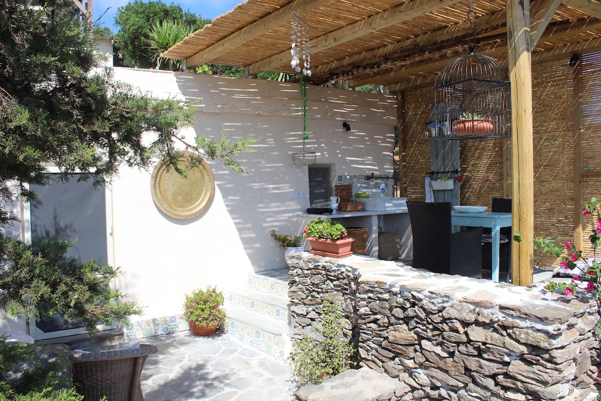 La CASA DE LA CAPILLA BIZANTINA es un escondite verdaderamente romántico. Disfruta de una privacidad completa y total con excepcionales vistas al mar y noches estrelladas desde tu terraza privada. LGBTQ+ amigable, ropa opcional y aislada; la capilla es autónoma: consta de un salón, cocina equipada (+ máquina de café espresso); suite de ducha/WC y un dormitorio en el entresuelo. Tiene su propio acceso privado. Disfruta de una noche de sueño perfecta, envuelto en lujosas sábanas sobre un colchón de buena calidad.