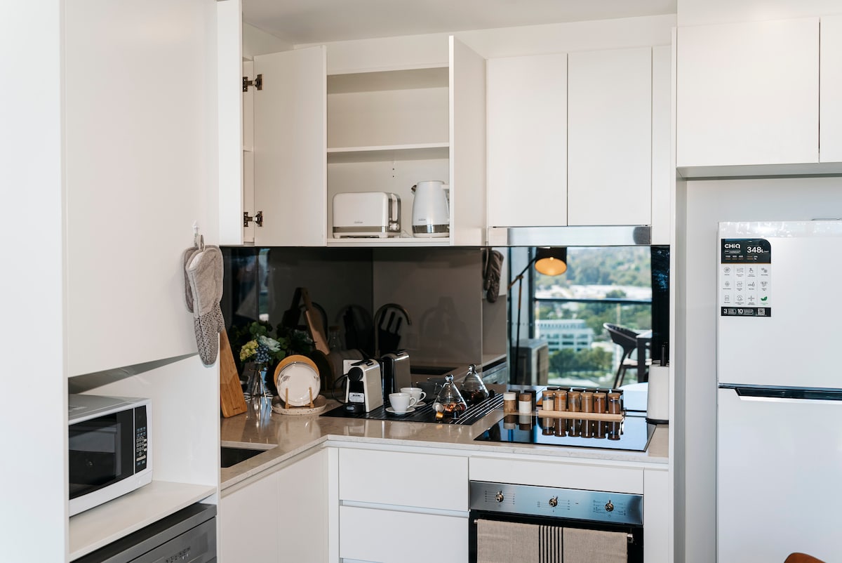 Disfruta de una experiencia elegante en este lugar céntrico en el nivel 17: - Gimnasio, sauna, piscina en el edificio - metro Woolies, BWS, kebab y restaurantes justo abajo - A 5 minutos a pie de McD y KFC. - A 5 minutos en coche de Westfield y UC. - A 12 minutos en auto de la ciudad. Los mejores servicios: - Samsung, el televisor inteligente Serif 4k - Nespresso con cápsulas gratuitas - Hervidor de agua y tostadora Sunbeam - Cama tamaño queen con colchón doble - Conjuntos de almohadas altos y bajos. Anfitrión profesional: - Vive en Canberra - 24/7 a través de la llamada - Respondedor