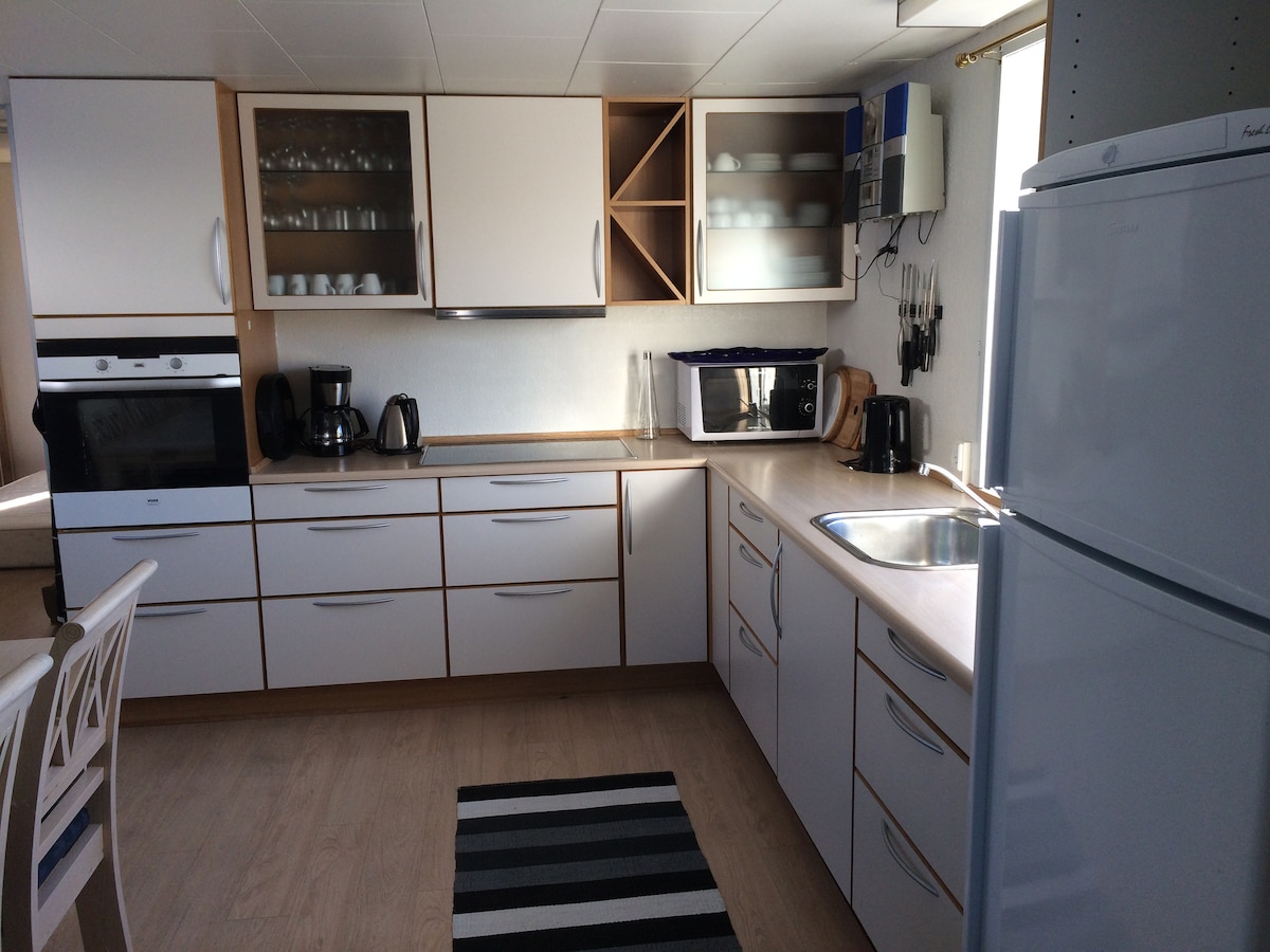 La casa tiene vistas a la bahía de discotecas y está cerca del centro de la ciudad. Tiene una terraza donde puedes sentarte afuera y disfrutar de las vistas. Si tienes suerte, puedes ver ballenas desde la casa en verano. Es una casa acogedora con sala de estar, cocina, 2 inodoros, 1 baño, esposa libre, toallas, ropa de cama. 3 dormitorios, uno grande con cama de moda y 2 camas pequeñas cada una.