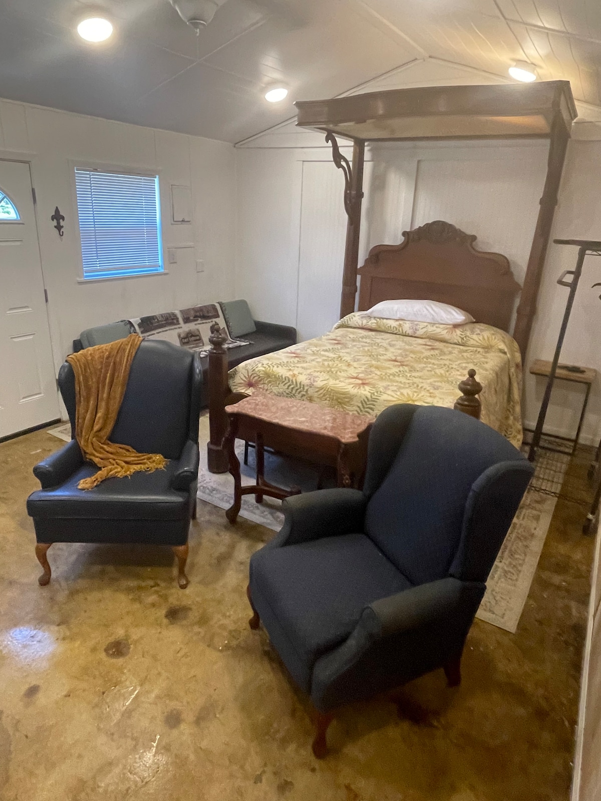 The spacious retreat is enclosed within a six-foot fence for privacy and can accommodate up to four people. It features a queen-size bed, a full-size futon, a 32" TV with DVD, wi-fi connection, full kitchen, private dressing area, and bath with shower. Just outside your front door is a relaxing 7,000 gallon swimming pool and covered patio. Stretch out in a rocker on the patio or on the porch of nearby Winsum Centennial Cottage. The Blue Moon Bungalow is an oasis from the demands of daily life.