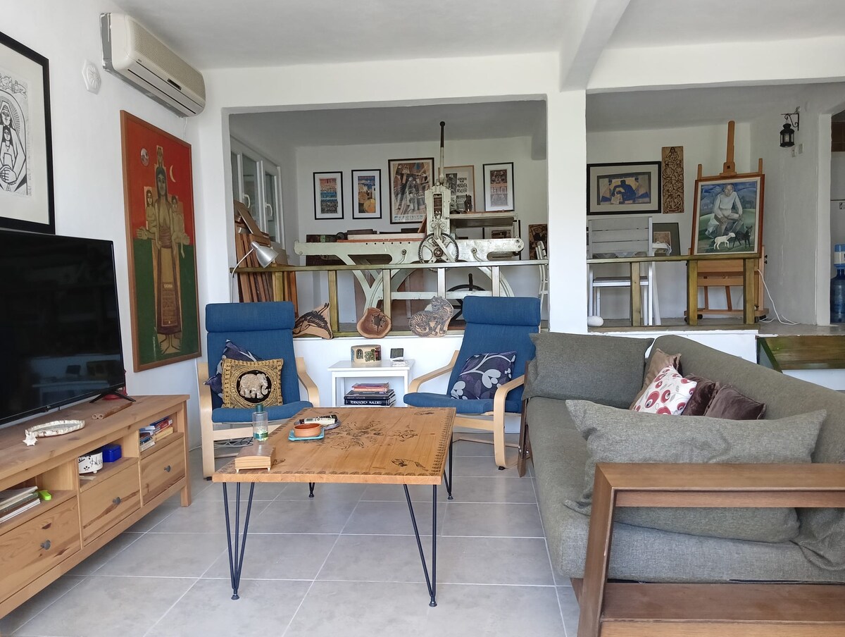 Nuestro lugar se encuentra en una bahía con una playa separada fuera del centro. Es una casa especial entrelazada con el placer del jardín, entrelazada con el arte. Este apartamento pertenece a mi difunto suegro, el profesor pintor. Fue el taller de Mustafa Asler. El apartamento también exhibe sus propias obras y herramientas de trabajo.
