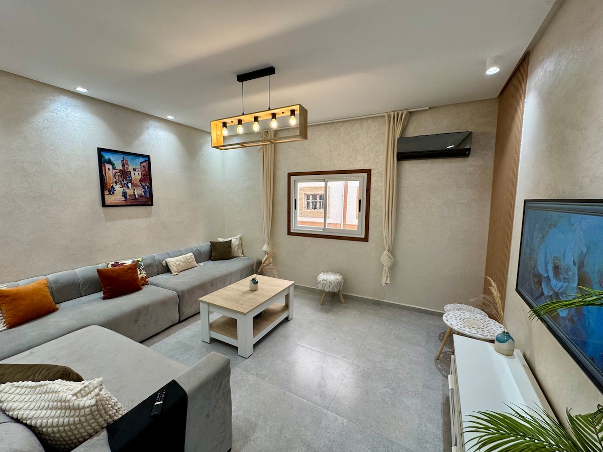 Spacious furnished apartment near the grand bazaar souk El had and close to all amenities, restaurants and shops. It includes a living room, an open fitted kitchen, a bathroom with toilet, two bedrooms, a large courtyard with a garden table and vegetation, satellite television, WiFi, hot water and a washing machine. 2 minutes walk from the big souk El had and 20 minutes walk from the beach and the tourist area (restaurants, bars, swimming pools, pub). Bright and very quiet apartment.
