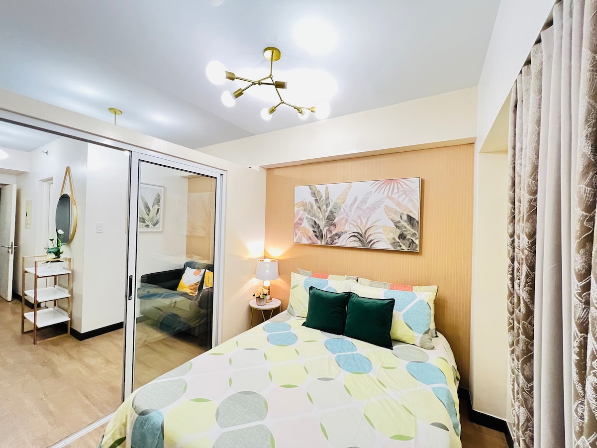 ¡Te damos la bienvenida a tu sereno oasis de inspiración bohemia! Este apartamento de 29 metros cuadrados bellamente diseñado cuenta con un relajante tema verde salvia, perfecto para la relajación y el rejuvenecimiento. Disfruta de acogedoras noches con Netflix en el lujoso sofá o prepara deliciosas comidas en la cocina totalmente equipada, con todos los utensilios de cocina y comedor. Convenientemente ubicado cerca de Ayala Mall Cloverleaf, Balintawak Market, Edsa y Skyway.