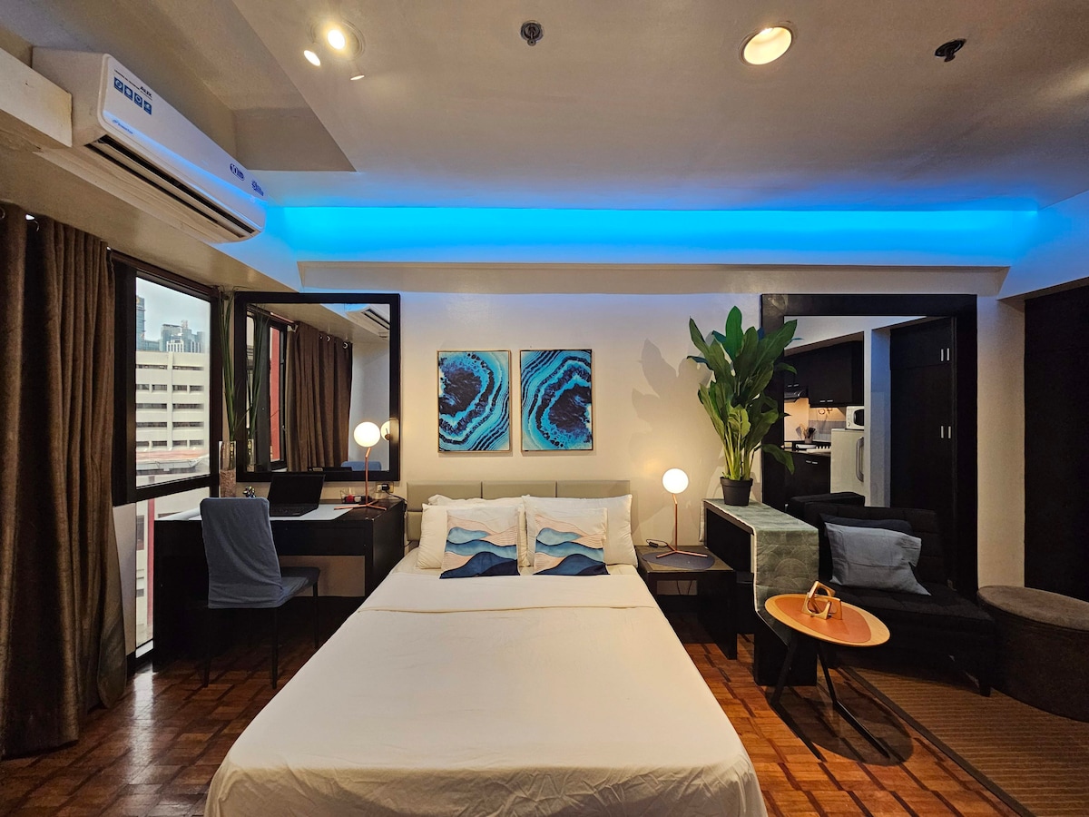 Disfrute de la comodidad moderna en este elegante departamento tipo estudio en Prince Plaza II. Cuidadosamente diseñado con detalles cálidos, decoraciones exuberantes y toques acogedores de estilo hotelero, este lugar es tu refugio tranquilo en el corazón de Makati. A pocos pasos de Greenbelt, Glorietta y el distrito central de negocios de Makati, disfruta de una comodidad inmejorable con tiendas, restaurantes y entretenimiento a la vuelta de la esquina.