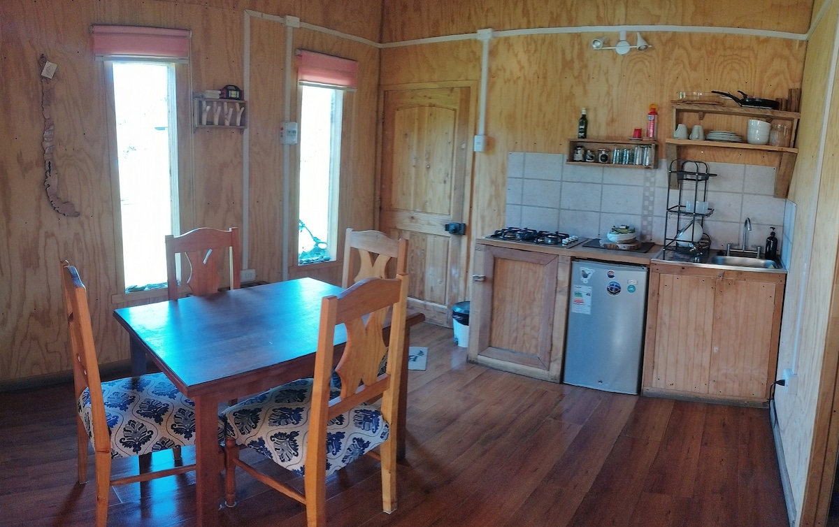 Disfruta de la verdadera paz de la Patagonia en nuestro refugio rústico, ubicado a solo 1 km de Puerto Río Tranquilo. Lugar perfecto para quienes buscan desconectarse en un entorno de campo, con el sonido del río aledaño. Ofrecemos: Descanso Natural y Relajo Total, Baño equipado con ducha caliente e hidromasaje, diseñado para renovar energías. Conectividad de Alta Velocidad: con internet satelital Starlink. Equipada para 4 personas, dos dormitorios, calefacción a gas y cocina encimera equipada.