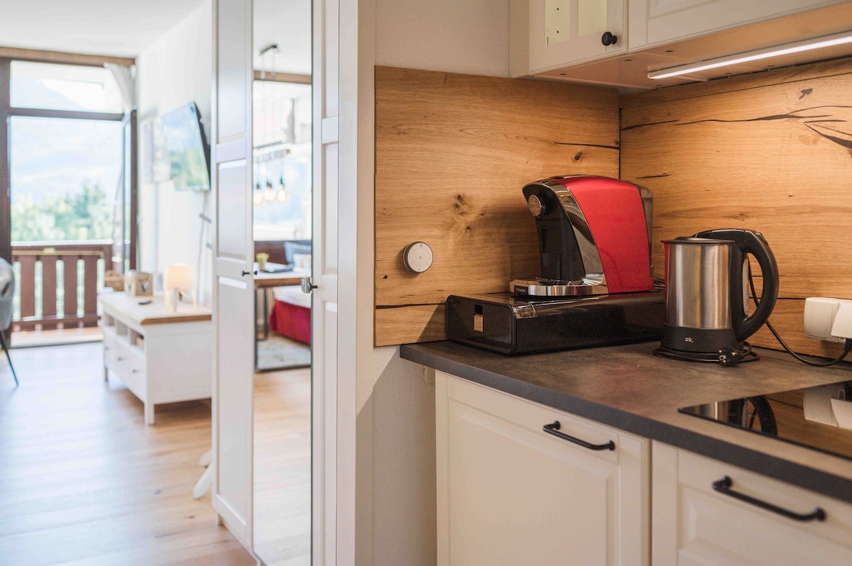 Nuestro apartamento de 35 m² con vistas al valle ofrece un amplio equipo (cocina americana con cocina de inducción, baño con ducha/inodoro, cama tamaño queen y una silla de ala para relajarse). La sala de estar se complementa con el sofá suave y la mesa de comedor, incluidas las sillas de tela, y contribuye al ambiente acogedor. Desde el gran balcón puedes reflexionar sobre el día con vistas a las montañas.