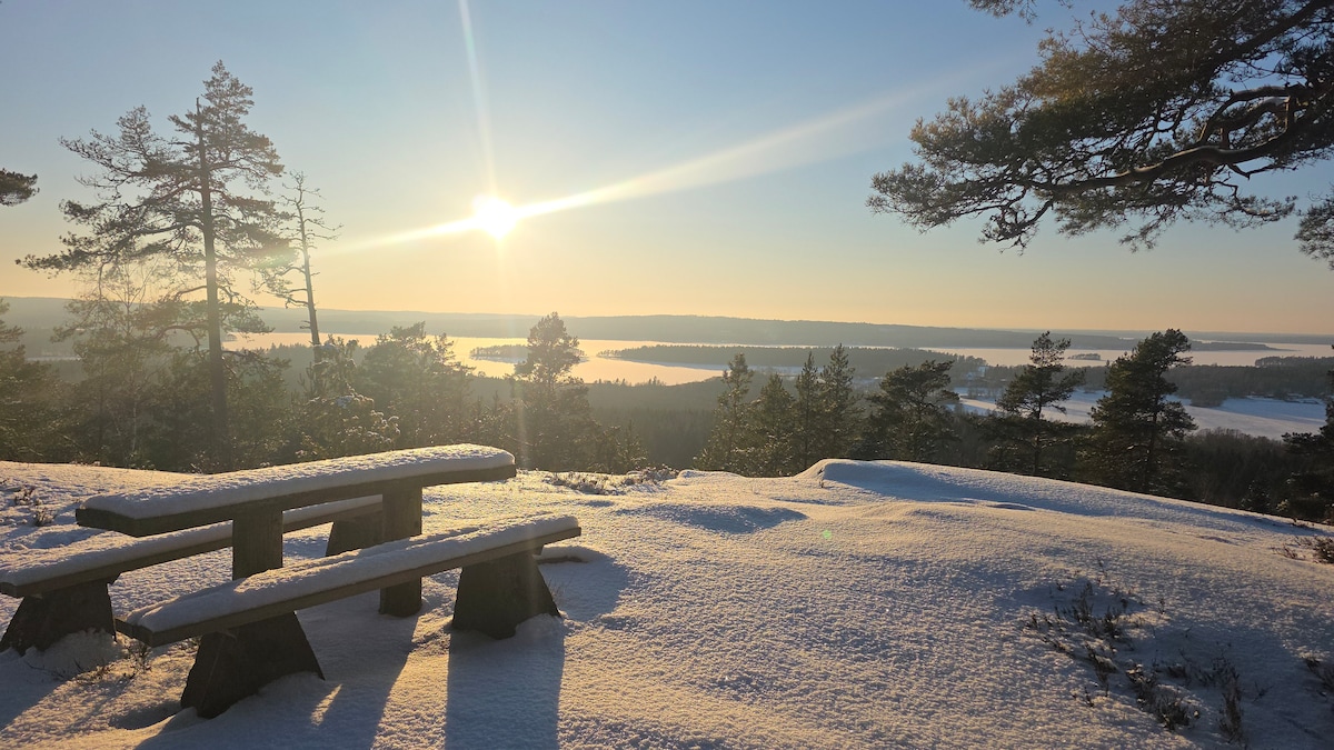 En una colina con vistas al hermoso archipiélago del norte de Vättern se encuentra nuestra moderna casa de campo de nueva construcción con grandes áreas de estar y una increíble altura de techo con una bonita entrada de luz. Aquí, un grupo/familia un poco más grande puede encontrar recuperación con proximidad a la naturaleza, pero aún así está a solo 10 minutos en coche de la hermosa pequeña ciudad de Askersund. El Parque Nacional de Tiveden está cerca de la larga playa de arena de Harjebaden. La casa estaba lista en otoño de 2018 y tiene todas las comodidades.