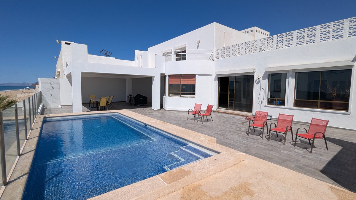 Amplia casa a la orilla del mar Con todo lo necesario para que pases agradables dias en la playa. Cuenta con 4 recamaras y 4 baños completos, 1 sala, 2 estancias con TV, 1 bar asi como un amplio patio con barra y asador de carbón. 7 minisplits, uno en cada recamara y 3 para áreas sociales, cochera cerrada y techada hasta para 4 autos. Cocina equipada con Micro, estufa, horno, licuadora, cafetera, tostador, cubiertos, platos, vasos, ollas y sartenes. Contamos con Wifi y Sky