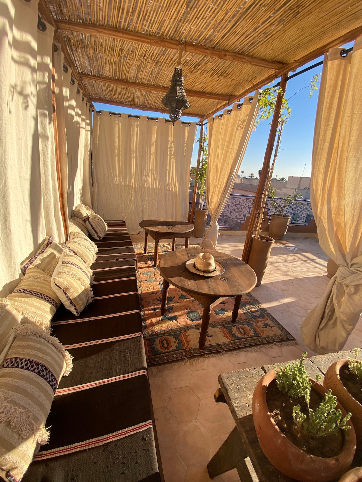 Notre Riad est une promesse d'évasion. Imaginez vos matinées bercées par le chant des oiseaux dans le patio et vos soirées sur la terrasse surplombant la ville rouge. Un mélange raffiné de zelliges traditionnels et de confort contemporain. Un salon de lecture pour s'évader, des chambres élégantes pour se ressourcer. Un patio rafraîchissant, pour le café du matin et un rooftop pour savourer le coucher du soleil. Hospitalité marocaine et confort absolu : votre parenthèse enchantée commence ici.