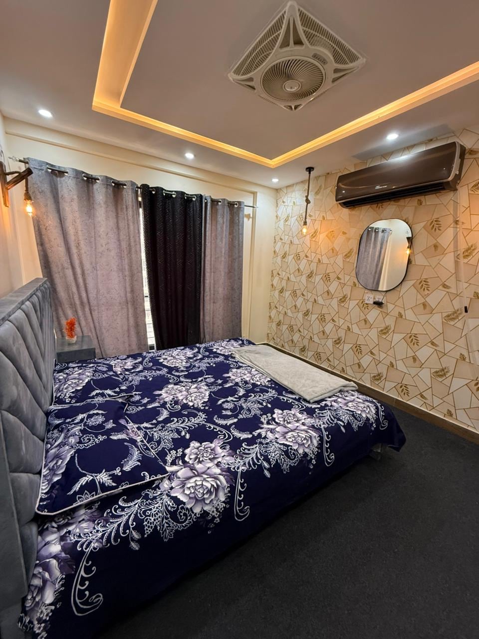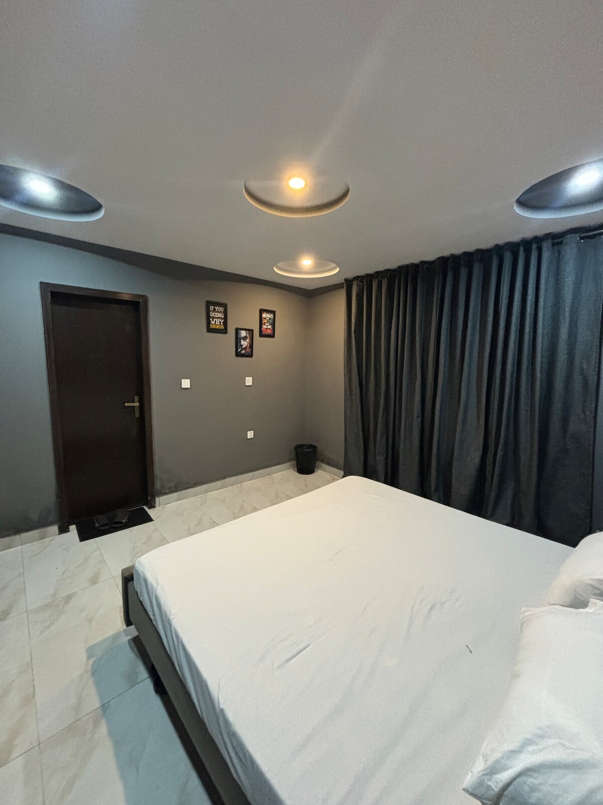 Welcome to Midnight Luxe Suite – a thoughtfully designed, cinematic black-themed apartment located in the heart of Bahria Town Lahore. This stylish space features a luxury designer bedroom with ambient LED ceiling and bed lighting, creating a warm, intimate atmosphere perfect for families, creatives, and business travelers. The modern living area includes elegant décor, a cozy seating setup, and a wall-mounted smart TV for Netflix nights. The apartment also offers a compact modern kitchenette.