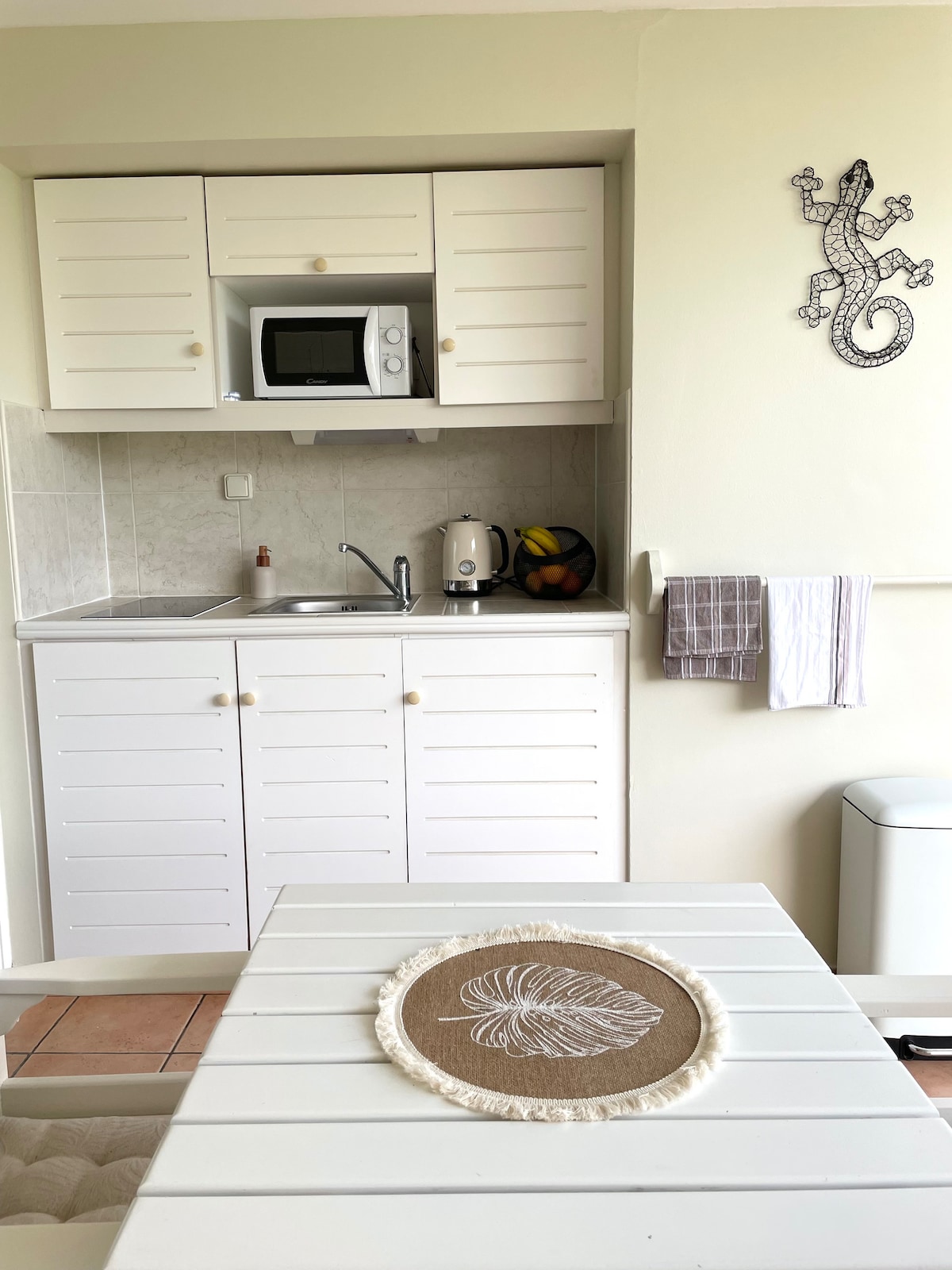 This is a large studio of approximately 24m² opening onto a covered outdoor terrace of 11m², which serves as the main living area of the accommodation thanks to its dining area, kitchenette, and exceptional view of the garden and sea. Sleeping arrangements (3): Choice of: 1 very large bed (L160) or 2 separate single beds (2xL90) + 1 single bed of L90.