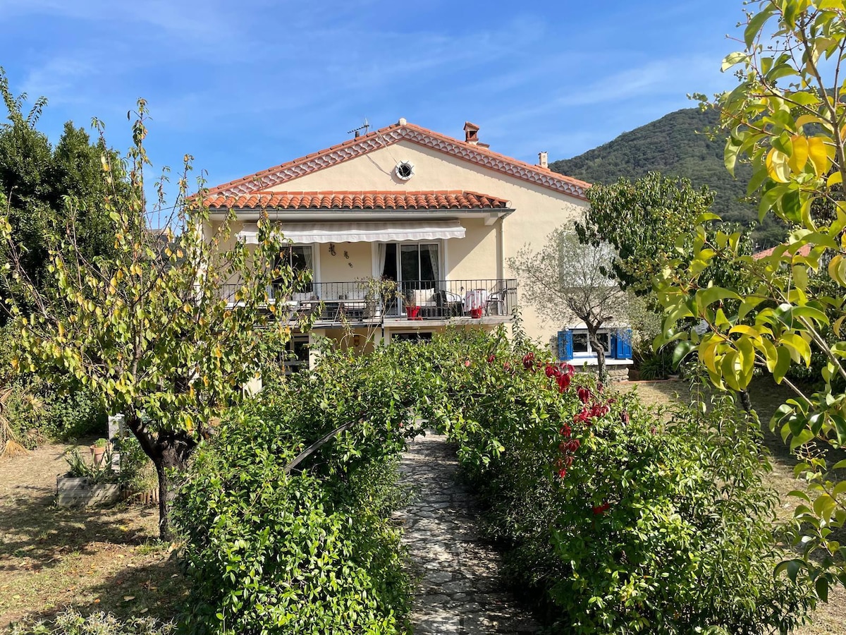 🌿 Entre mar, montaña y lagos Bonita casa de campo luminosa con salón catedral, vista panorámica a los Alberts, 2 habitaciones acogedoras, terraza íntima de 20 m², frente a la vía suave V8 para sus paseos. Con una ubicación ideal, un entorno natural muy accesible en coche: a 20 minutos del mar, cerca de Céret, Colliure, España... ✨ Casa rural familiar, sin servicio de hotel✨ ✨tarifas Curistas ✨ 🧖♀️Opción de sauna, paquete de ▶️ ropa de cama si se desea modalidades ▶️ Leer «mi alojamiento» 🙏 Estaré encantado de recibirlo 🌿