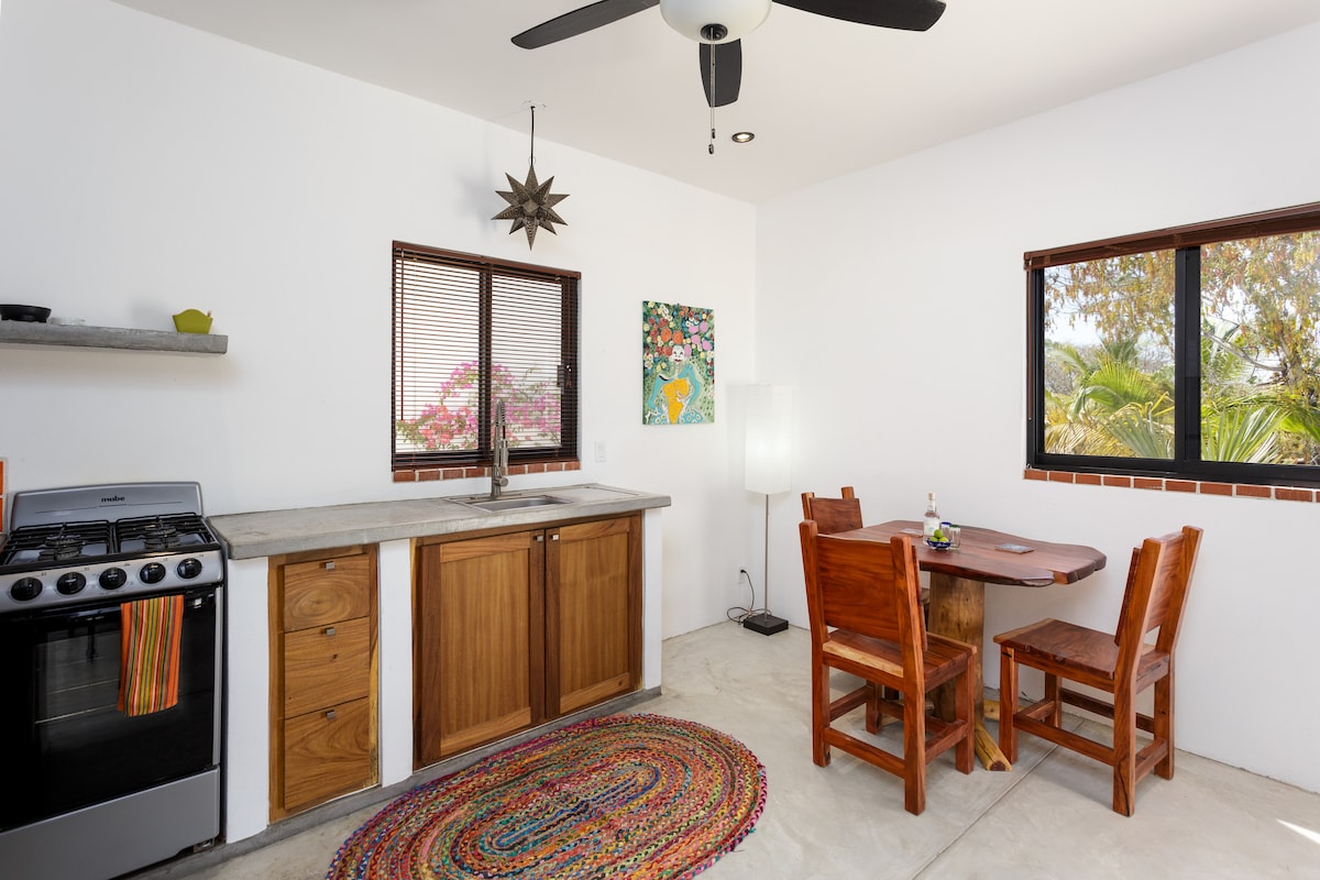 This wonderful casita in the pueblo called Mulege has an all-new kitchen, bedroom, and lovely new bathroom, and walk-in closet. Located in a clean predominantly Mexican neighborhood with paved streets, sidewalks, streetlights and just a couple blocks from central Mulege with good markets, an abundance of places to enjoy a good meal and the wonderful people in this quiet little village. No gangs, no guns, no crime. We live next door on the same tree shaded acre with a lush garden setting.