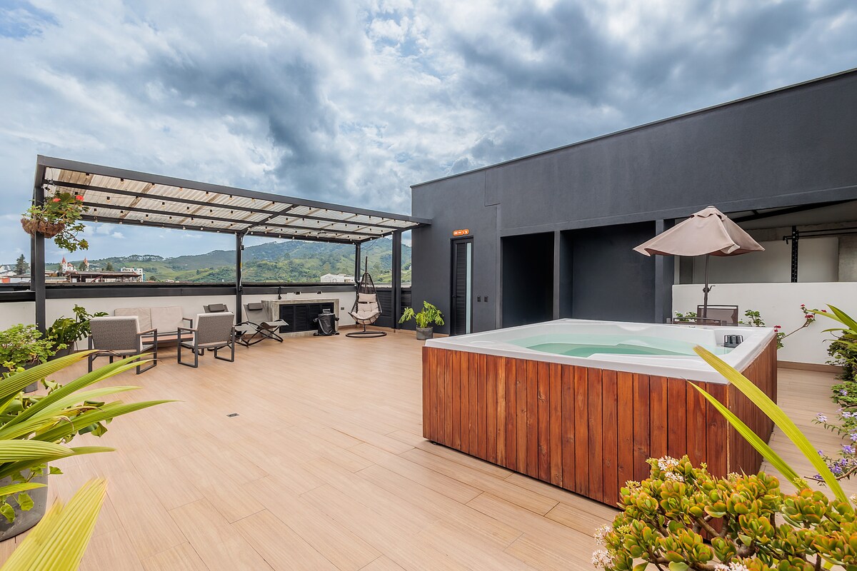 Disfruta de una experiencia con estilo en este alojamiento céntrico, ubicado a 15 minutos del centro de Pereira y a 30 minutos de filandia y Salento. Rodeado de vegetación y aves silvestres. Con un diseño minimalista, combinando la comodidad de un hotel en medio de la naturaleza. Su baño es protagonista al contar con una increíble vista, adicionalmente su magnífica tina noruega ubicada en un deck de madera japonesa.