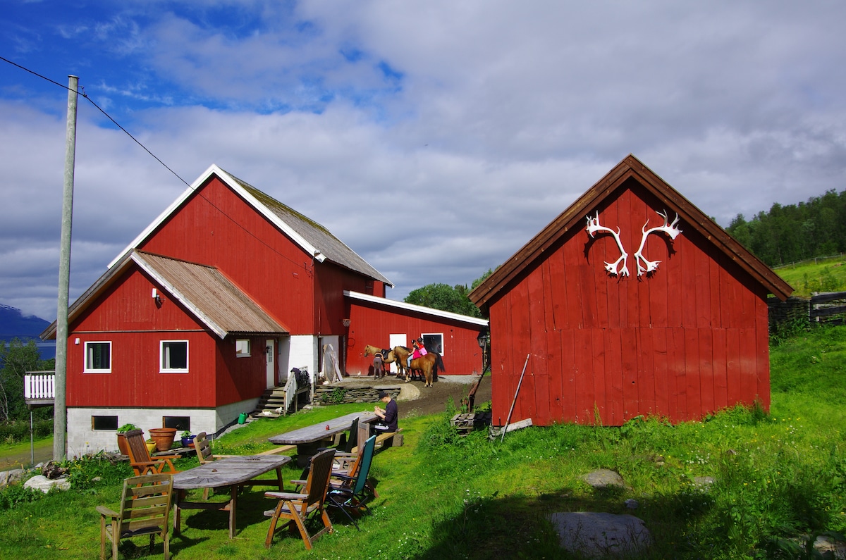 ¿Quieres ver la vida agrícola noruega de cerca o simplemente relajarte en un entorno tranquilo? ¿Esquí? ¿Pesca en hielo? ¿Ves las auroras boreales? ¿Conoces el sol de medianoche? Hermosa naturaleza justo afuera de la granja y atractiva ubicación cerca de muchos destinos populares. La casa está tranquila desde la casa principal de la granja donde vive el anfitrión. Fuera de la casa verás los caballos en la granja durante todo el año, y en verano también se pueden ver las cabras en los campos junto a la casa. La granja también cuenta con conejos, gatos y perros.