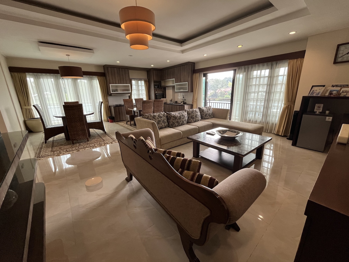 La villa de 500 metros cuadrados cuenta con 4 dormitorios con baño privado, una piscina privada, con interiores espaciosos y cómodos. Rodeada de naturaleza, la villa ofrece una refrescante vista de la montaña y la colina, sin olvidar la hermosa ciudad de Bandung. El entorno es seguro, tranquilo, sin ruidos urbanos y relajante. Usted puede ir a trotar por la zona, jugar al golf en la casa club de golf cercana, ir de excursión y hacer un montón de actividades al aire libre!