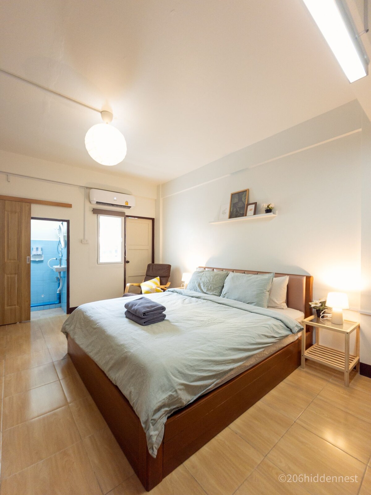 #206hiddenNest es una habitación privada en un apartamento de poca altura ubicado en el lugar local BKK. Mercado nocturno cercano y fácil de llegar al centro de Bangkok en barco y tren aéreo. Este alojamiento está en el segundo piso (solo a pie, sin ascensor), excepto del terremoto. ✓ Comida callejera en la planta baja ✓ A 10 pasos del 7 al 11 ✓ 2 minutos al mercado nocturno. A ✓ 10 minutos a pie del servicio de barco a CTW. ✓ A 5 minutos en auto /a 15 minutos al estadio Rajamangala. ✓ 5 min mini camión taxi 8 THB/viaje O 15 minutos a pie del tren Sky (línea amarilla-Mahat Thai Station)