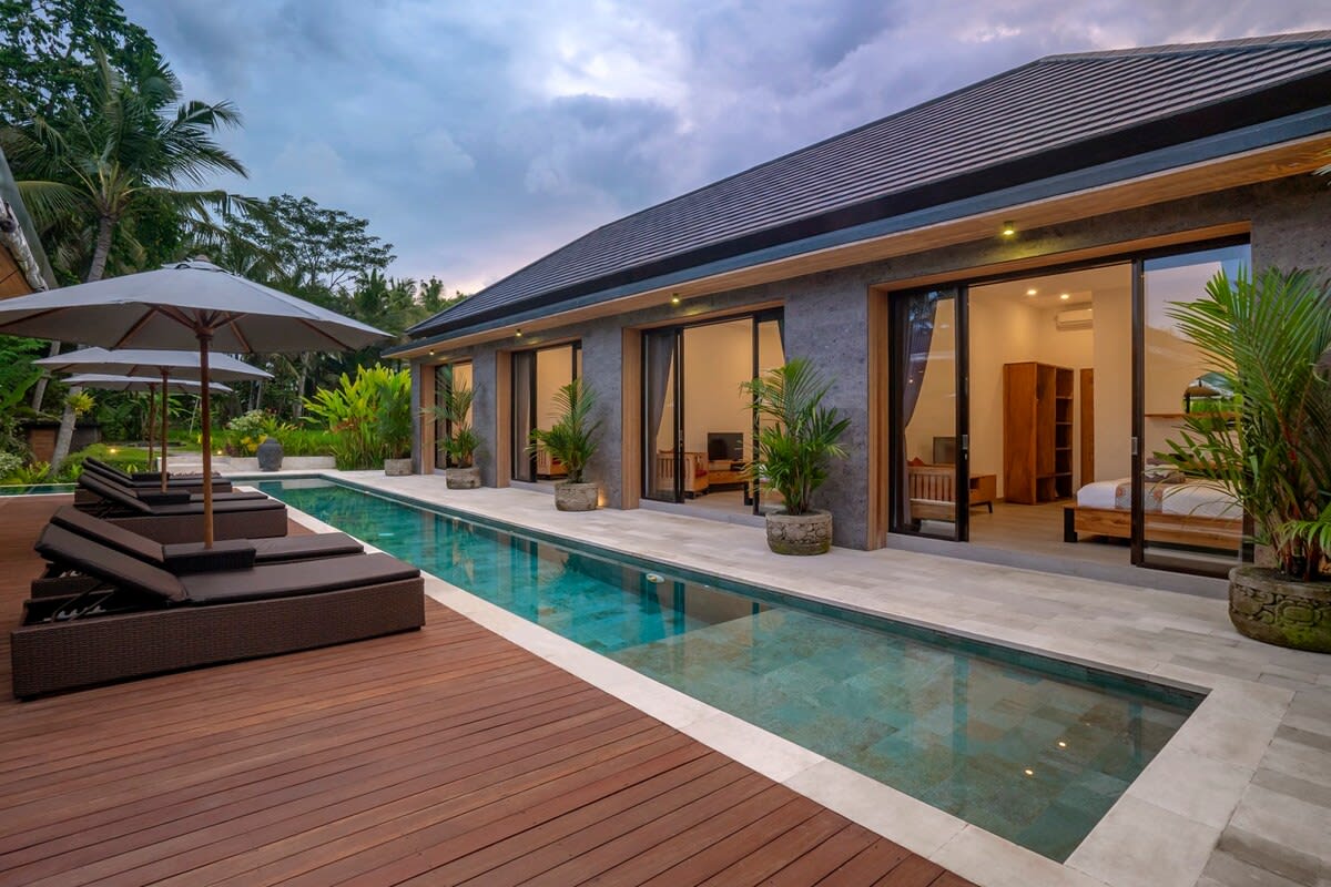 Escápate al paraíso en nuestra lujosa villa de 2 dormitorios en Ubud, tu refugio de bienestar personal. Ubicada entre la selva y las terrazas de arroz, disfruta de un gimnasio estilo CrossFit, yoga shala, cocina completa, sistema de sonido Sonos en toda la villa y comodidades modernas. Los dormitorios se abren con puertas de mariposa a un patio, una piscina de zafiro y vistas a la selva. Cada una tiene un baño privado con 2 duchas; una tiene un baño de jardín con duchas de lluvia bajo las estrellas. A minutos del centro de la ciudad, combina tranquilidad, lujo y servicio de 5 estrellas.