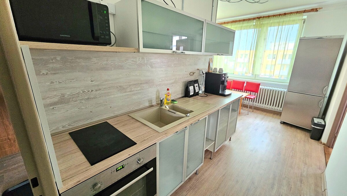 Departamento moderno en Trenčín: ¡comodidad, privacidad y excelente ubicación! Disfruta de tu estancia a solo 1 km del centro de Trenčín, cuya parte principal comienza en la plaza Mierov directamente debajo del icónico castillo de Trenčín. Adecuado para 2 adultos y 1 a 2 niños. ✔ 2 habitaciones (1 dormitorio con una cama doble grande y 1 sala de estar con sofá cama y una gran cocina premium con electrodomésticos incorporados, 1 baño superior grande con inodoro Estacionamiento privado reservado GRATUITO justo en la entrada.