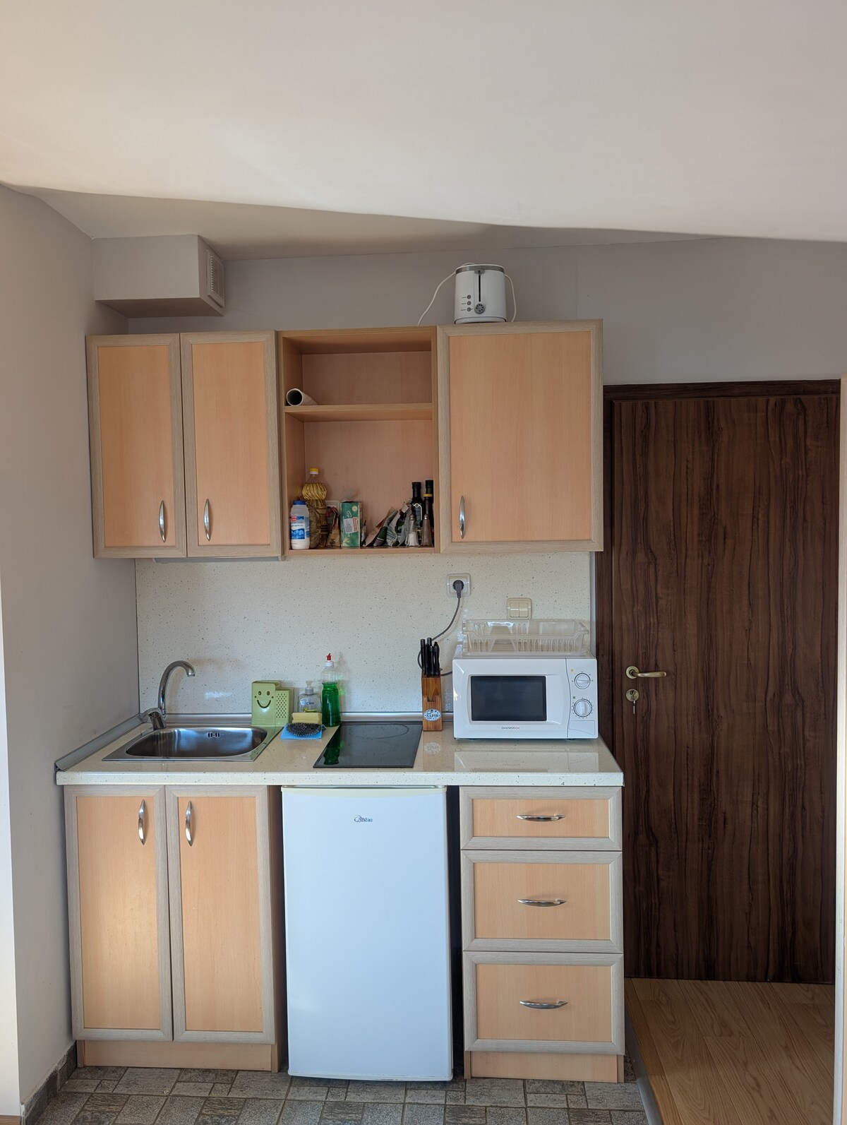 El estudio está ubicado en el complejo Green Life en Bansko. El complejo Green Life consta de varios edificios separados que están uno junto al otro. El estudio está en un edificio que está a unos 100 pies del edificio principal. El complejo se encuentra al comienzo del parque nacional, rodeado de una hermosa naturaleza. En las inmediaciones del complejo Green Life hay muchos senderos para caminar por el bosque, muchos arroyos, manantiales... a 200 metros del complejo hay una fuente de agua potable. La estación de partida de la góndola está a unos 800 metros de distancia.