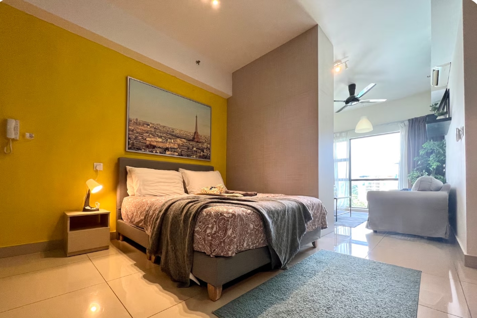 Apartamento de 2 dormitorios equipado con 3 aires acondicionados, internet de alta velocidad y el más reciente es un purificador de agua ideal para alojar a 4 personas. Sereno entorno en planta alta, completo con piscina y gimnasio. Ubicado cerca del aeropuerto KLIA, Malasia. Disfruta de una estancia sin estrés con llegada autónoma las 24 horas, convenientemente ubicado a solo 15 minutos del aeropuerto internacional T1 o T2. Tanto si tienes una salida temprano por la mañana como si llegas tarde, ahorra tiempo y relájate antes de tu vuelo. Grab está disponible las 24 horas.