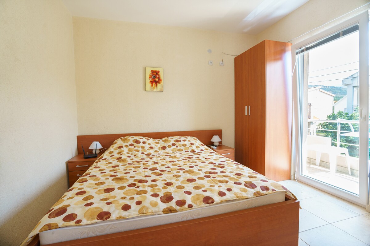 Planta alta de la villa de dos pisos con una entrada independiente. El departamento está ubicado en el pueblo de Šušanj, a 15 minutos a pie de la playa y de la zona para caminar. Lugar tranquilo y apacible. El apartamento tiene capacidad para 2 o 6 huéspedes cómodamente. El apartamento tiene una terraza con vistas al hermoso jardín, al mar y a una antigua iglesia católica en las montañas. Renovación parcial en 2023. El departamento tiene una cocina totalmente equipada. Aire acondicionado. Barbacoa en el jardín. Batut para niños. Estacionamiento gratuito.
