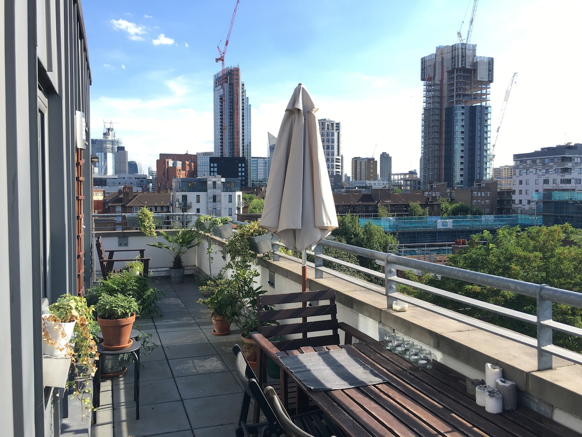 Te damos la bienvenida a nuestro impresionante ático en Londres. Disfruta de unas vistas de 180 grados del horizonte de Londres desde tu terraza privada en la azotea. Perfectamente situado para explorar toda la ciudad, con conexiones de transporte subterráneo, todo a un corto paseo. El edificio tiene vistas a Regent's Canal y está justo enfrente de Shoreditch Park. También tiene una pizzería familiar, cafetería, gimnasio y supermercado, todo dentro del edificio. *Se aplican las reglas de la casa adicionales. Léelas antes de reservar.