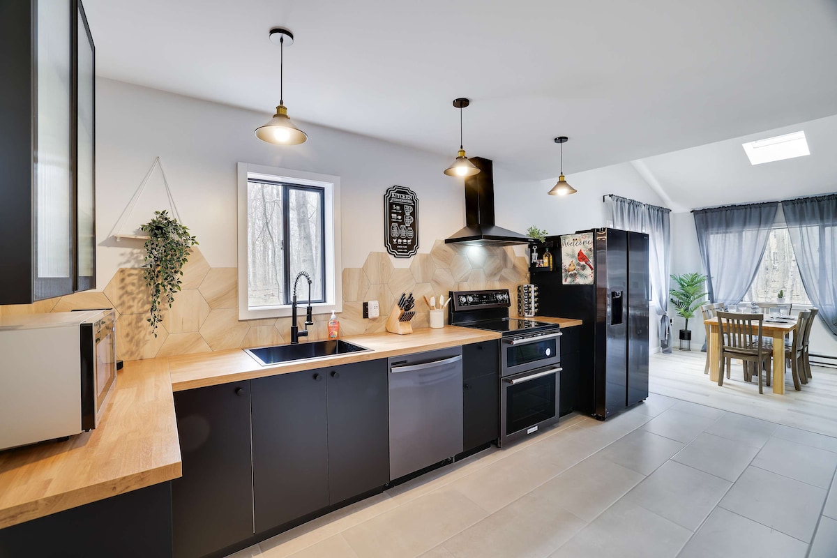¡Escápate a nuestra casa recién remodelada y aislada en un rancho moderno ubicado en el corazón de las montañas Pocono! Este lujoso refugio de 4 dormitorios y 2 baños cuenta con una sala de estar. Relájate en el amplio patio al aire libre, el comedor al aire libre y el salón privado. Relájate alrededor del fogón de acero recuperado bajo las estrellas. Reserva ya tu escapada y vuelve a conectar con la naturaleza con estilo. ¡Roku Smart 4kTV en cada habitación!