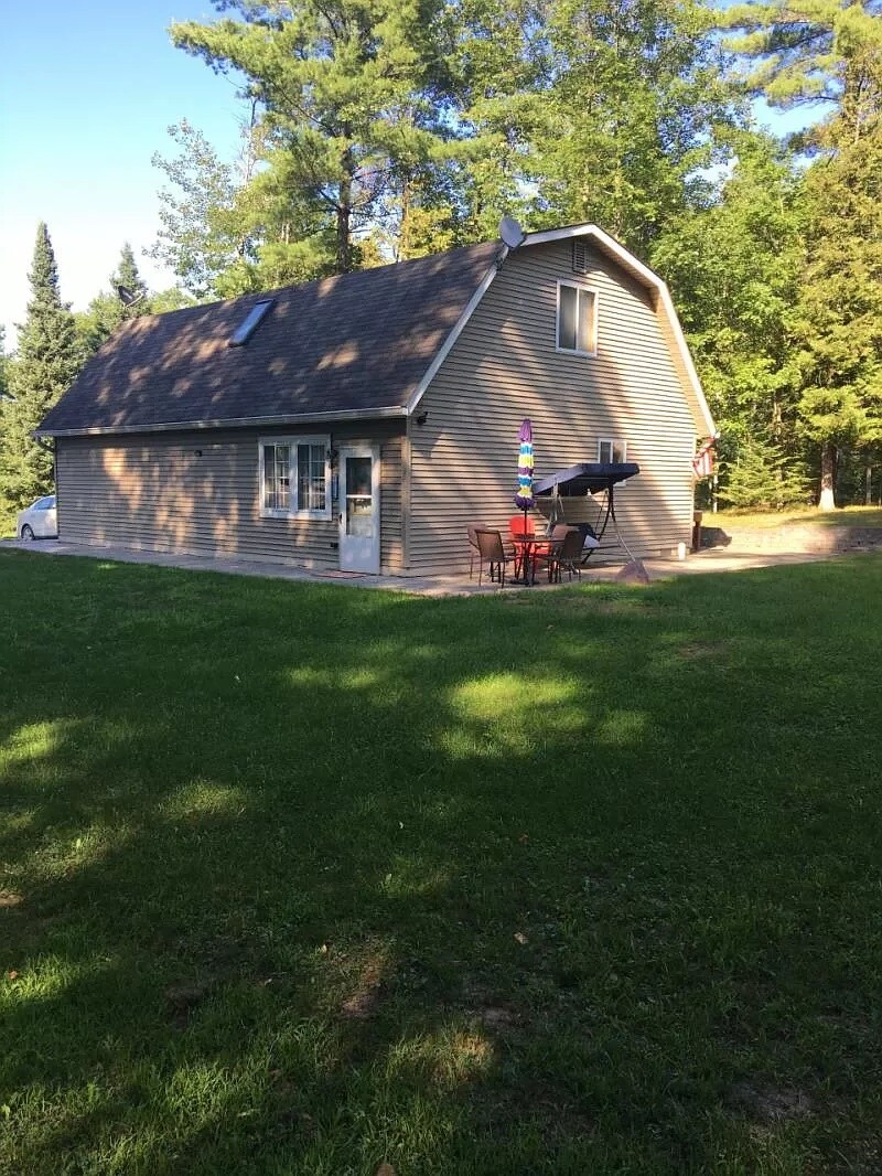 Our cabin in the woods is a quiet refuge, not a party place. Built with many unique features: log cabin room with vaulted ceiling, log walls in kitchenette/upstairs small dinette seating area and log wall in sunroom. Carriage style Barn doors, from grandparents old chicken coop. The metal stair railing designed & laser cut with pine trees. Downstairs walkout basement has concrete log beams & posts, as well as some concrete tree branches. Trails are for quiet travel only, no motors.
