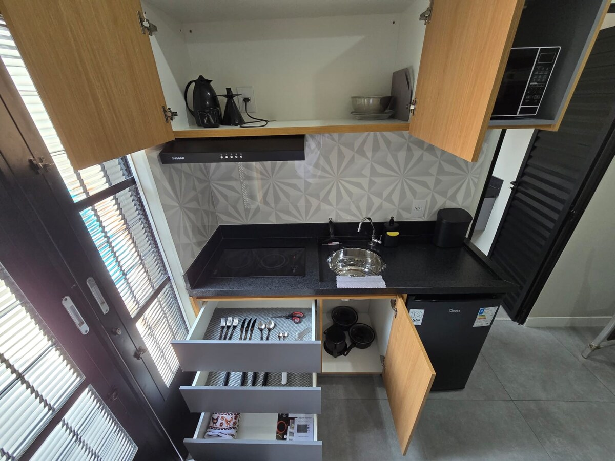 Acogedor y bien ubicado estudio en Bauru. Ya sea por trabajo, estudio u ocio, ¡aquí encontrarás el lugar perfecto para tu estadía! Nuestro estudio ofrece comodidad y tranquilidad, con una ubicación estratégica. El espacio cuenta con: 1 cama doble tamaño super queen; (ofrecemos toallas y ropa de cama) Cocina equipada con minibar, microondas, vitrocerámica y utensilios de cocina; TV inteligente; Wifi ¡¡¡Al lado de la lavandería de autoservicio Lavo!!!