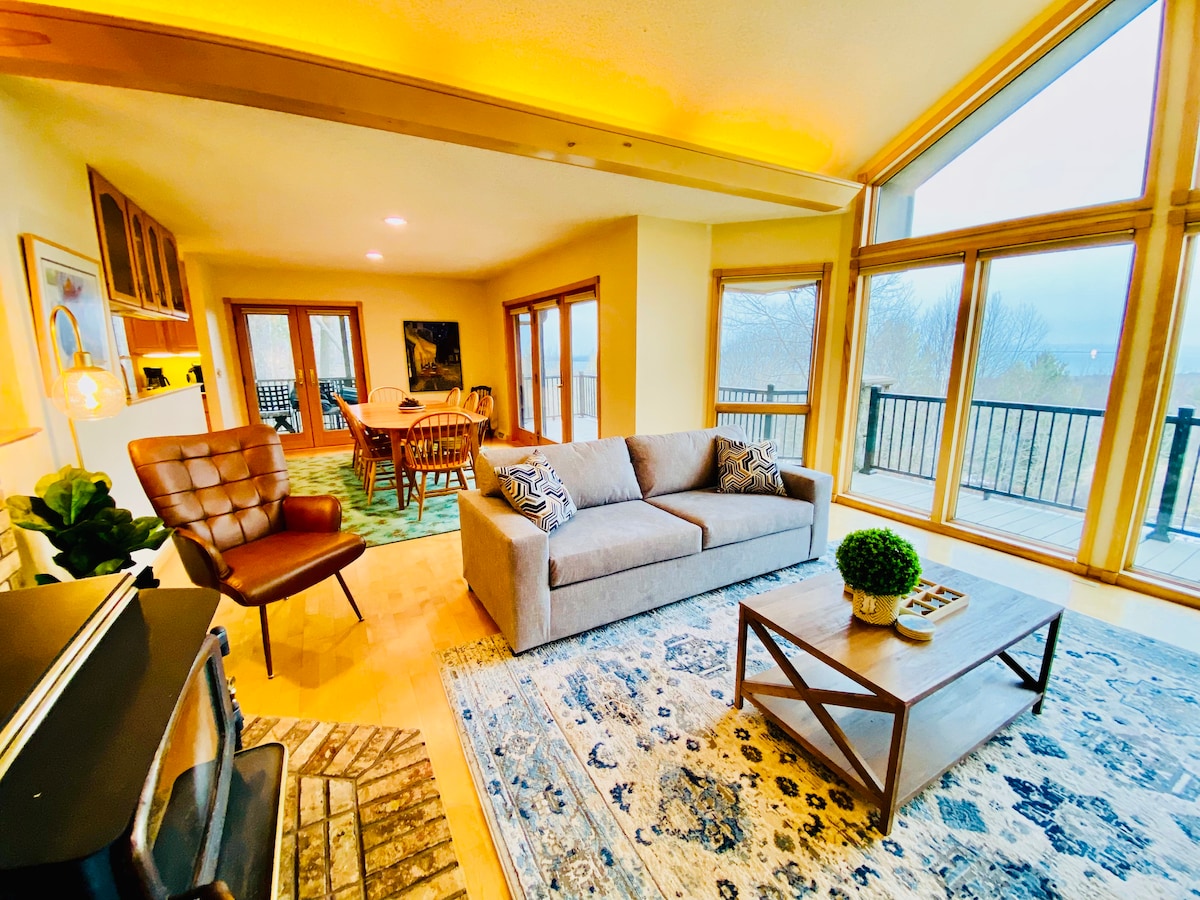 -Family friendly vacation home -Bayfield Hilltop Retreat w/Glowing Reviews! -1.56 Acres of privacy, Madeline Island Views -Screened in porch & large composite deck -Private Dead-End Street; Ample Parking -TVs in all Bedrooms -Wood-Burning Fireplace -Fully Equipped Kitchen -Spacious Primary Suite -Near Downtown, Marina & Apostle Islands -Bonus lounge Room W/infared Sauna, a 65-inch TV, Bean Bags & board games - Spacious Primary Bedroom W/ Bathroom & Deck Access.